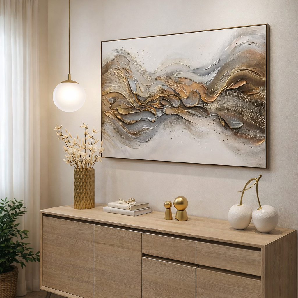 Ten obraz jest gotowy do zawieszenia, co sprawia, że można go wygodnie wyeksponować w swoim wnętrzu. Do jego zawieszenia będziesz potrzebować jedynie dwóch gwoździ, które wbijesz w ścianę. Możesz nałożyć krosno podobrazia na gwoździe, które utrzymają obraz na miejscu. Alternatywnie, jeśli zdecydujesz się na ramę, możesz zawiesić obraz w niej i umieścić na gwoździach.